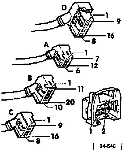 - Connect LED tester to connector terminal 1 and to battery positive (B+), or jumper to positive (B+) using cable from VW1594 connector test kit.