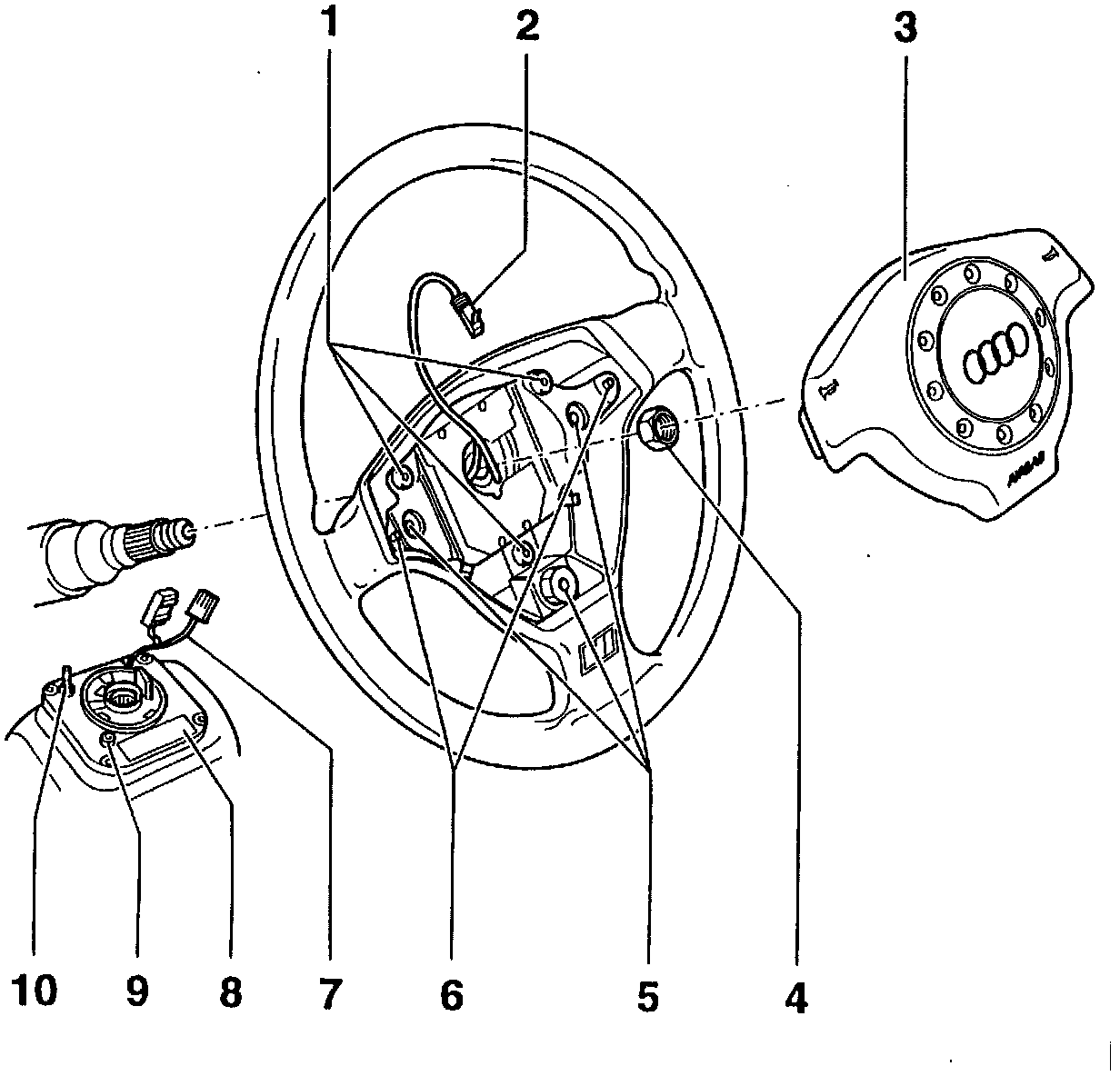 ^ Wheels must be in straight-ahead position when removing steering wheel and spiral spring. After removal, the spiral spring must not be rotated.^ Remove airbag