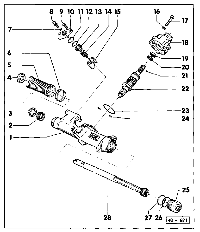 Slide steering rack in from opposite end through steering gear housing and through installation sleeve -a-.