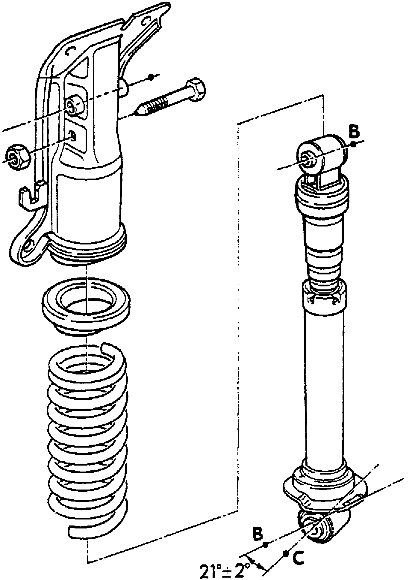 1. Place assembly into a suitable spring compressor equipped with a positioning protractor. Note position of angle B-C, Fig58, (righthand and lefthand shocks are different) for later assembly.