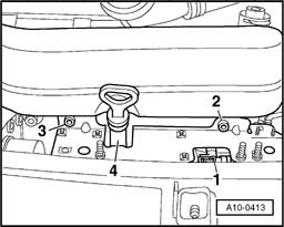 - Unbolt bracket for solenoid valves -2- and -3- in front of intake manifold and detach dipstick guide tube -4-.