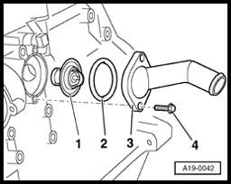 - Remove bolts -4- and take off elbow connection, O-ring and thermostat -1-.