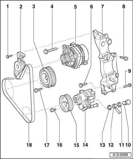 ^ The following illustration shows the belt drive on vehicles without air conditioner.