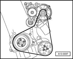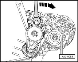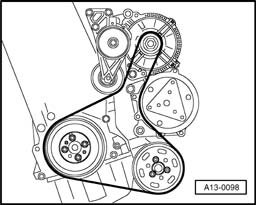 ^ Before removing the ribbed belt, mark the direction of rotation using chalk or a felt marker pen. If the belt rotates in the wrong direction when it is reinstalled, this can cause breakage. Ensure that the belt is properly seated in the pulleys when installing.