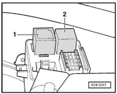 - Secondary Air Injection (AIR) pump relay -1- (under cover, left at bulkhead) must trigger and the Secondary Air Injection (AIR) pump motor -V101 - must run in intervals. The relay -2- need not be observed in this context (it is involved supplying voltage for the Motronic Engine Control Module (ECM) power supply relay -J271 -)