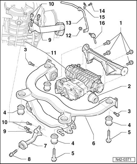 - Remove bolts 14. Tightening torque: 20 Nm. Tighten both bolts to an initial torque of 5 Nm.
