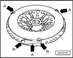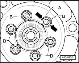 Note: To prevent damage to dual-mass flywheel when removing, bolts - B - must not be unscrewed using an air-powered or impact wrench. Only removing bolts by hand is permitted.