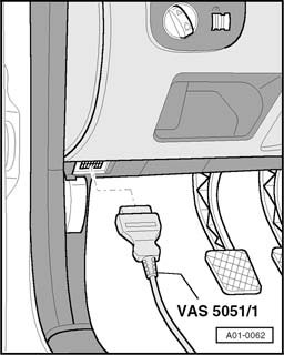 - Connect Vehicle Diagnosis, Testing and Information System VAS 5051 B with diagnostic cable VAS 5051/1 or VAS 5051/3 to diagnostic connector with ignition switched off.