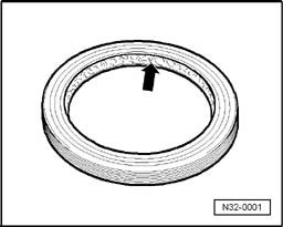 ^ Lightly coat radial shaft oil seals outside circumference, fill space between sealing lips - arrow - halfway with sealing grease G 052 128 A1.