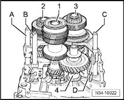 Input shaft, output shafts (driven shafts), differential, bevel gear transfer case and shift rods (transmission as of approx. 04.2003), removing and installing, 02M/02Y, 5 & 6 Speed M/T, AWD