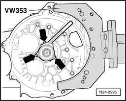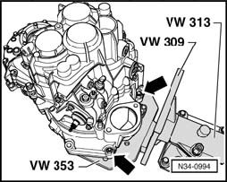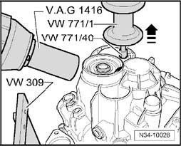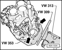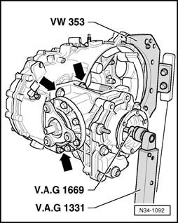 - Pull off transmission housing from clutch housing direction of - arrow - using slide hammer VW 771.