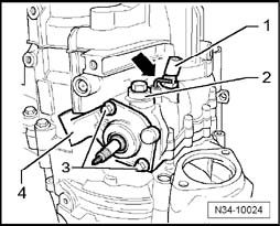 - As shown in illustration, take output shaft for 1st to 4th gears - 3 - with shift rods - 4 - in right hand.