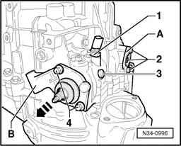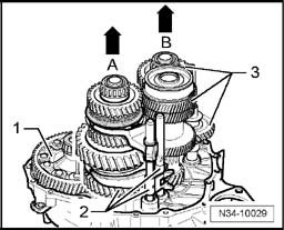 - At the same time, 2nd technician lifts input, reverse and output shaft for 5th/6th gear - 3 - together with shift rods out of clutch housing - arrow B -.