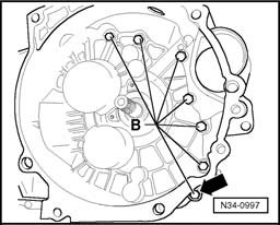 - Remove bolts - B - for securing clutch housing to transmission housing.