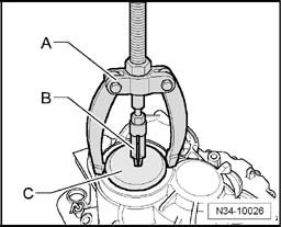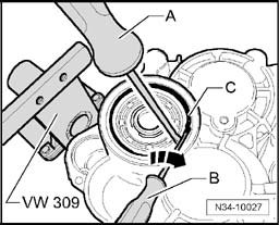 - When removing securing ring - C - from grooved ball bearing of input shaft/transmission housing, hold one end of securing ring using a screwdriver - A -.