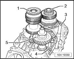 - Insert input shaft - 1 -, output shaft for 5th/6th gears - item 2 - together with shift rod - 3 -, shift fork - 4 - and reverse shaft - 5 -.