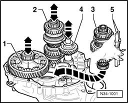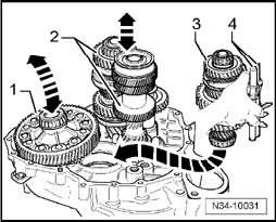 - Lift differential - 1 - using left hand. With the right hand, lift output shaft for 1st to 4th gears together with shift rods - 2 - - arrow A -.
