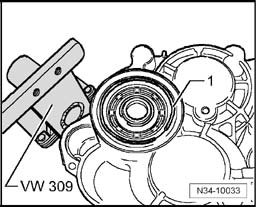 - Heat transmission housing using heat gun V.A.G 1416 in area of bearing seat for grooved ball bearing/input shaft to 100°C for approx. 10 minutes.