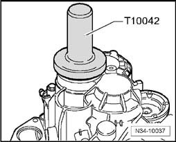 - Drive in cap into transmission housing until tool stop using pressure piece T10042.