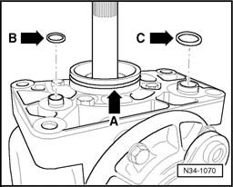 - Replace O-ring for sealing of bevel gear transfer case/manual transmission - arrow A - and O-rings for sealing oil supply sleeves -arrows B and C -.