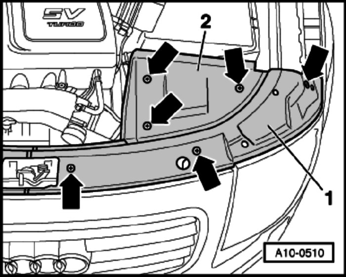 - Remove right-hand cover panels -1- on lock carrier and -2- above expansion tank.
