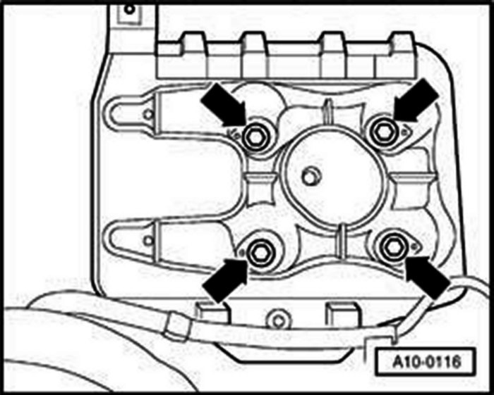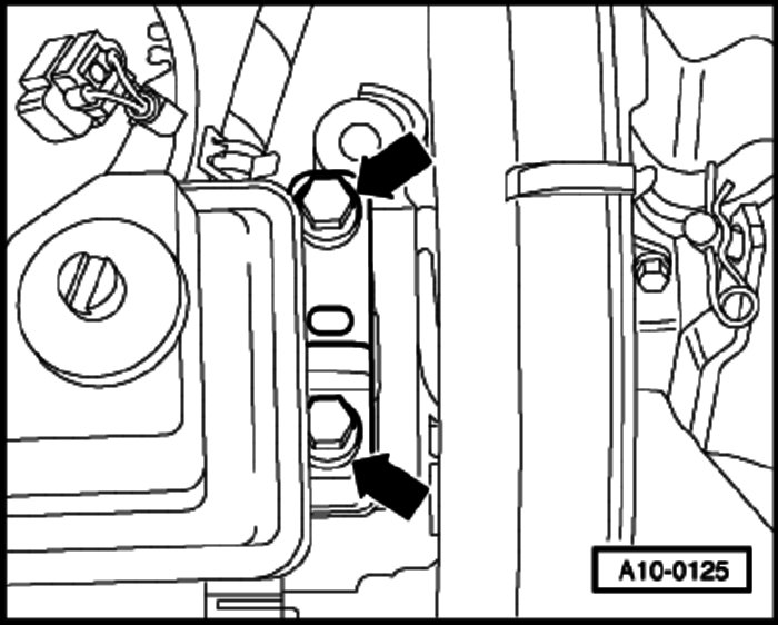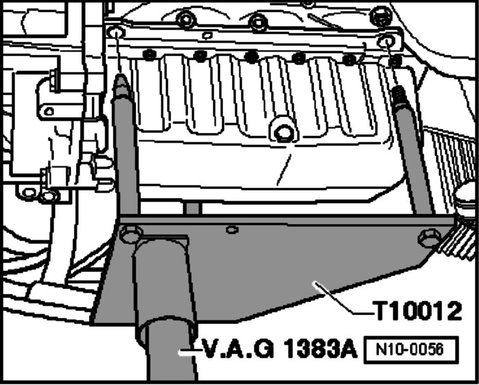 - Bolt engine bracket T10012 to cylinder block with securing nut and bolt (M10 x 25/8.8). Tighten to about 20 Nm