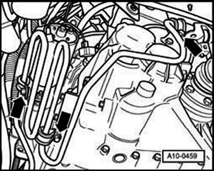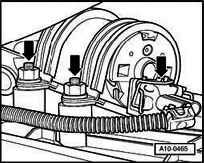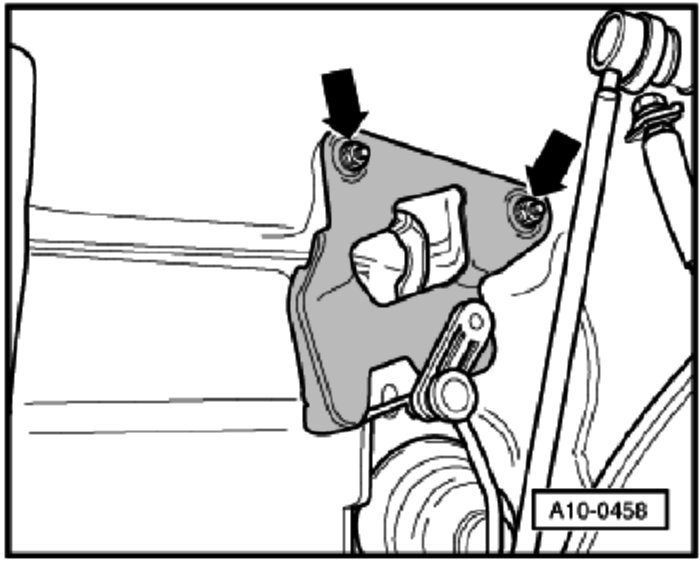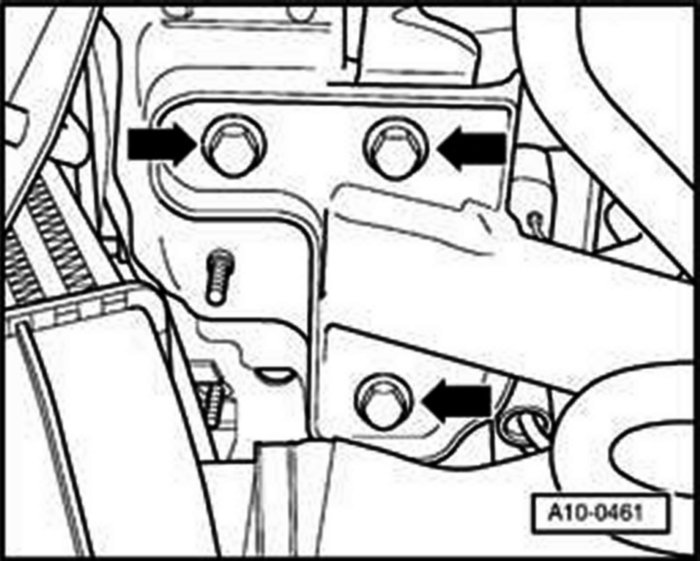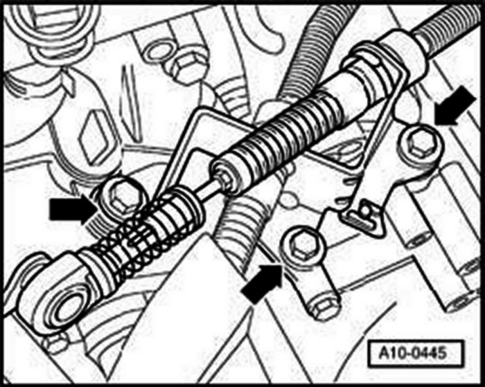 - Remove bolts (arrows), remove selector cable support bracket from transmission and place to one side.