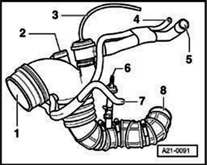 8- Detach air intake hose at connection on turbocharger and remove hose.