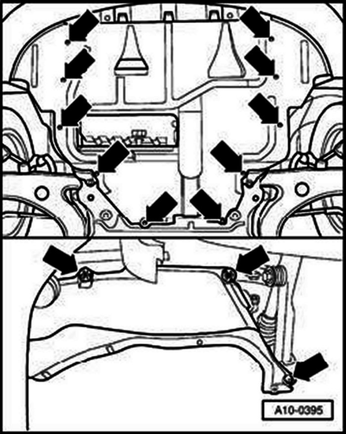 - Place engine/transmission jack V.A.G. 1383 A with universal support 1359/2 under subframe.