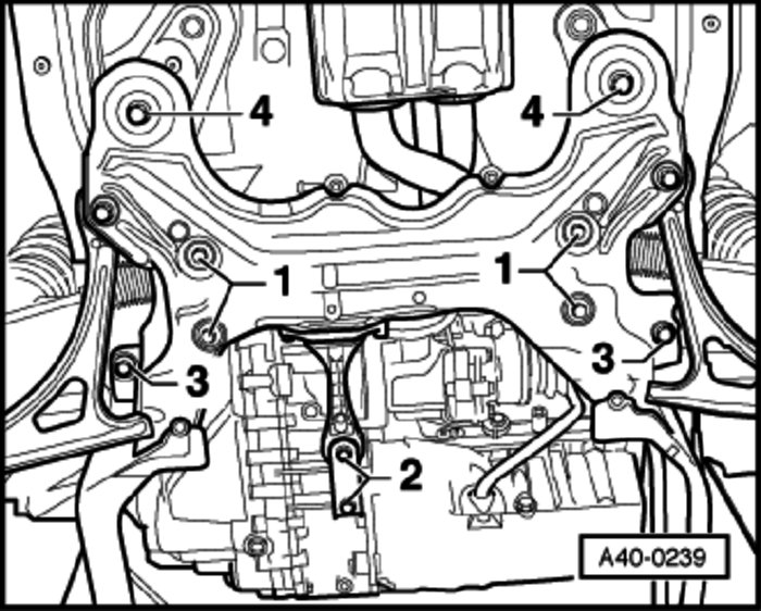 - Remove subframe bolts -3- and -4-.