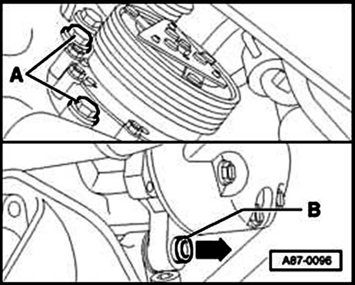 - Unbolt A/C compressor -A-, lift clear and tie up on hood lock together with refrigerant hoses.
