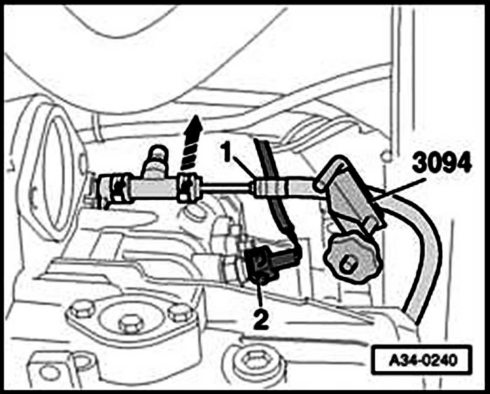 - Using hose clamp 3094, clamp off pressure hose -1- to clutch slave cylinder.