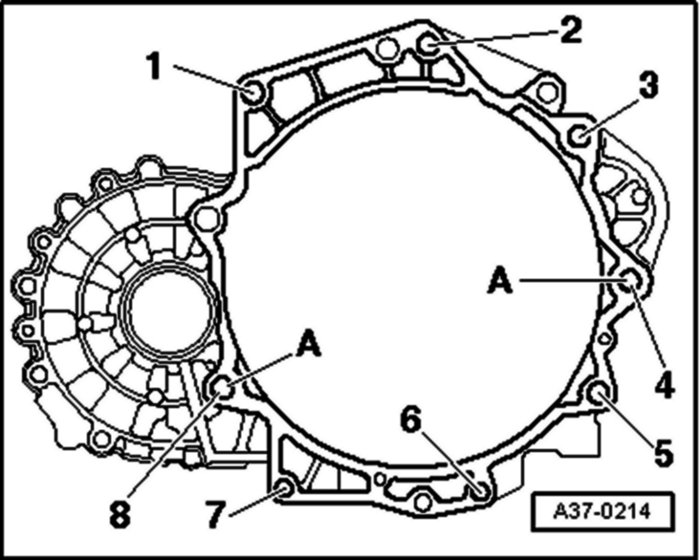 - Remove bolts -1- to -8- on engine/transmission flange.