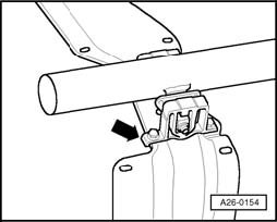- Using body repair saw, e.g. V.A.G 1523, cut exhaust pipe at separating point - arrow 2 - at right angle.