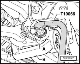 Installation position: The oil filter - A - is located on right side of vehicle, concealed by subframe, near front mounting bracket - B -.