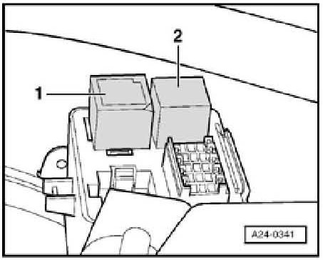 - Secondary Air Injection (AIR) pump relay -1- (under cover, left at bulkhead) must trigger and the Secondary Air Injection (AIR) pump motor -V101 - must run in intervals. The relay -2- need not be observed in this context (it is involved supplying voltage for the Motronic Engine Control Module (ECM) power supply relay -J271 -)