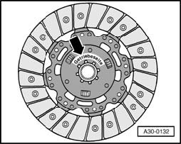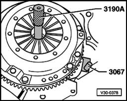 ^ Contact surface of pressure plate and clutch plate lining must make complete contact on flywheel. Only then insert mounting bolts.