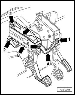 - Rotate stop - A - for clutch pedal in direction of - arrow - and remove.
