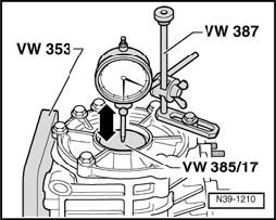 ^ Install Measuring Lever VW 388 so that dial gauge extension is at a right angle to measuring surface