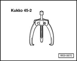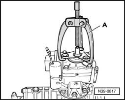 - Remove drive shaft flange. If difficult, use three arm puller - A - (three arm puller, e.g. Kukko 45-2).