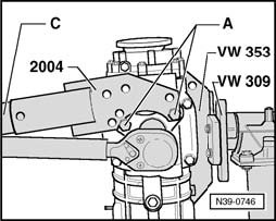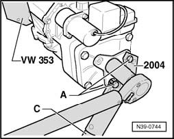 Note: When loosening hex nut, counter hold flange / drive shaft over tube - C - using transmission holder V.A. G 2004 (2nd technician).