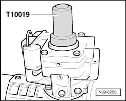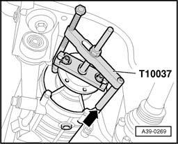 - Remove right flanged shaft, to do so thread lower support of puller T10037 into housing - arrow -.