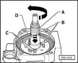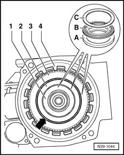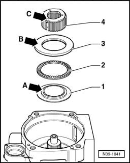 - Then insert axial needle bearing - B - and thin thrust washers -C- for axial needle bearing.
