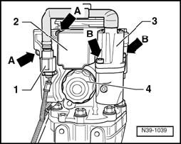 - Install Haldex clutch pump - 3 - and Haldex clutch control module - 2 -. Tighten bolts - arrows A - - and - arrows B - to tightening torque.