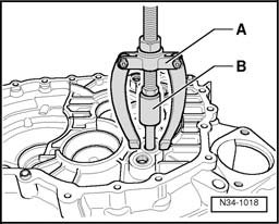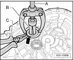 - When pulling off, press together seal - arrow - of cylindrical roller bearing using pliers - C -.