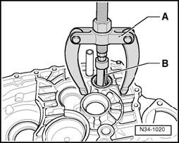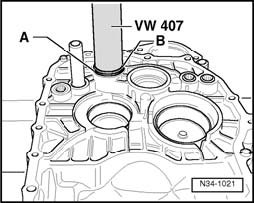 - During pressing sequence, place thrust washer - B - for reverse shaft on needle sleeve - A -.