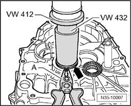 - When pressing in circlip - arrow - of cylindrical roller bearing, compress using pliers - A -.