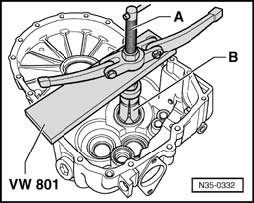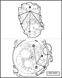 - Install transmission housing and tighten bolts - A - as well as - B - to tightening torque in diagonal sequence.