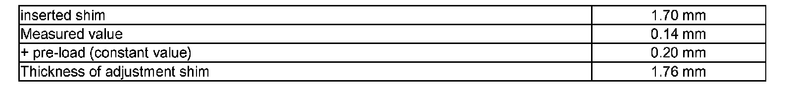 The specified bearing pre-load is reached when determined measured value (0.14 mm) is subtracted from inserted adjustment shim (1.70 mm) and a constant pre-load value (0.20 mm) is added. Example: