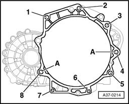 - If installed, install small cover plate - A - for flywheel behind bevel gear transfer case, tighten bolt - arrow -.